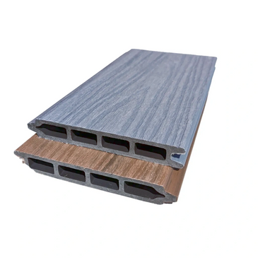 Eco Deck™ Premium Composite fence boards are available in teak or light grey. These boards blend wood fibres and recycled plastic materials, providing an embossed real wood grain appearance on one side and a smooth texture on the other.